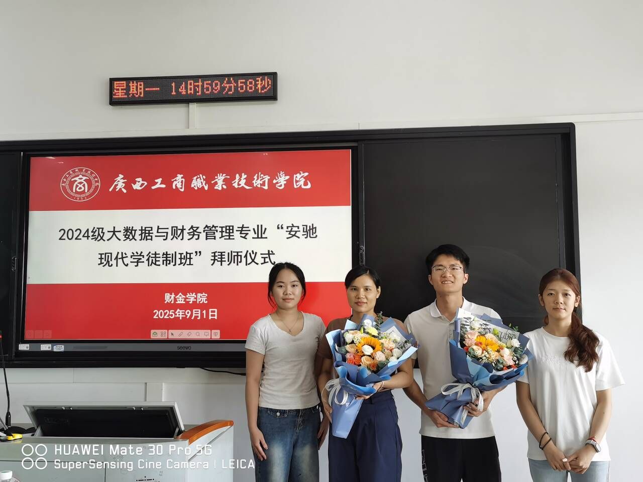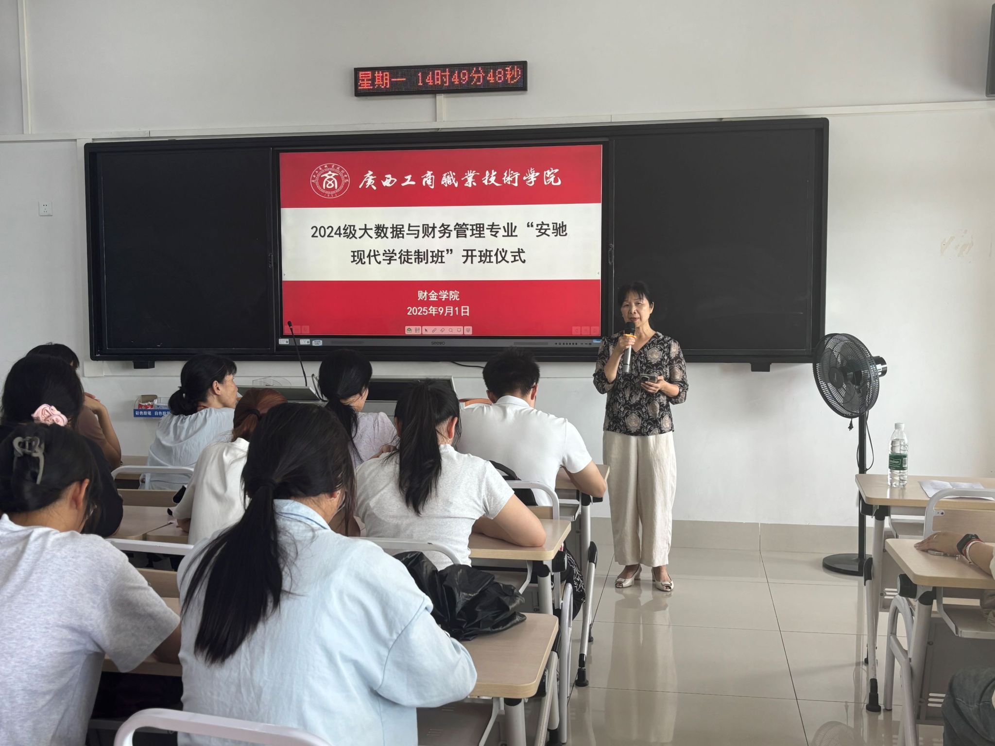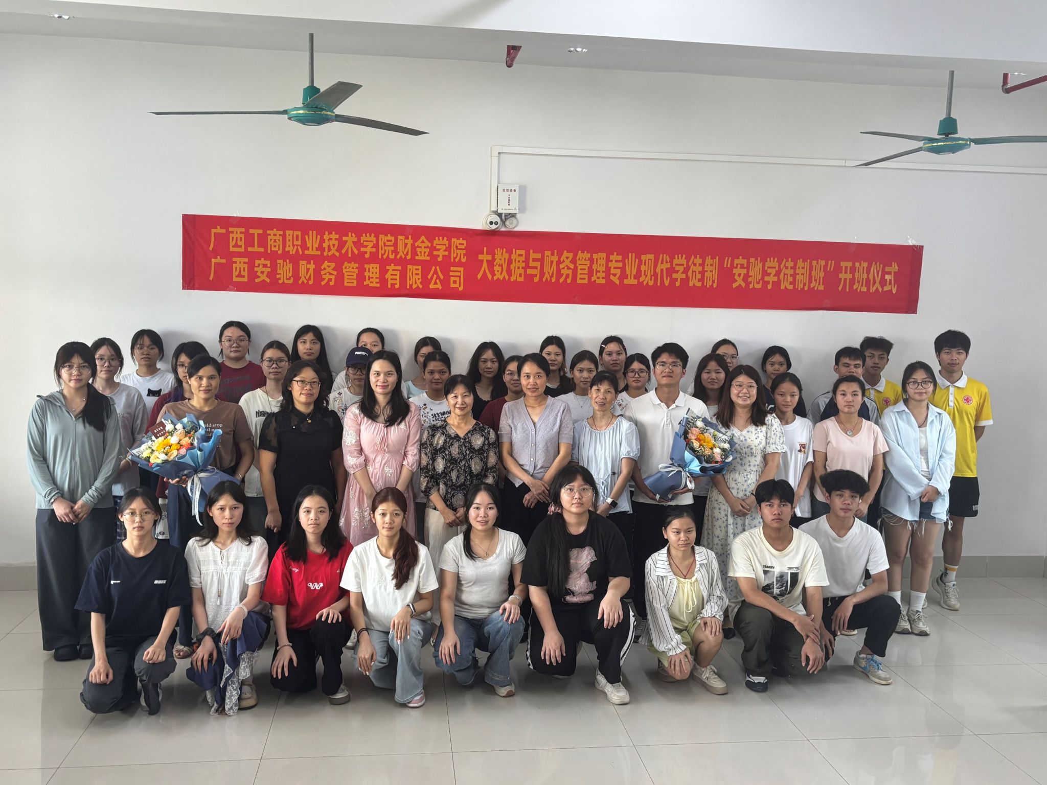 2025年9月1日下午,财金学院在武鸣校区举行2024级大数据与财务管理专业“安驰现代学徒制班”开班仪式。财金学院院长粟卫红、副院长王嘉玲、财管教研室主任黄春燕,广西安驰财务管理有限公司副总经理周朝泳、总经理助理吴静等出席开班仪式,学徒制班全体学生参加开班仪式。