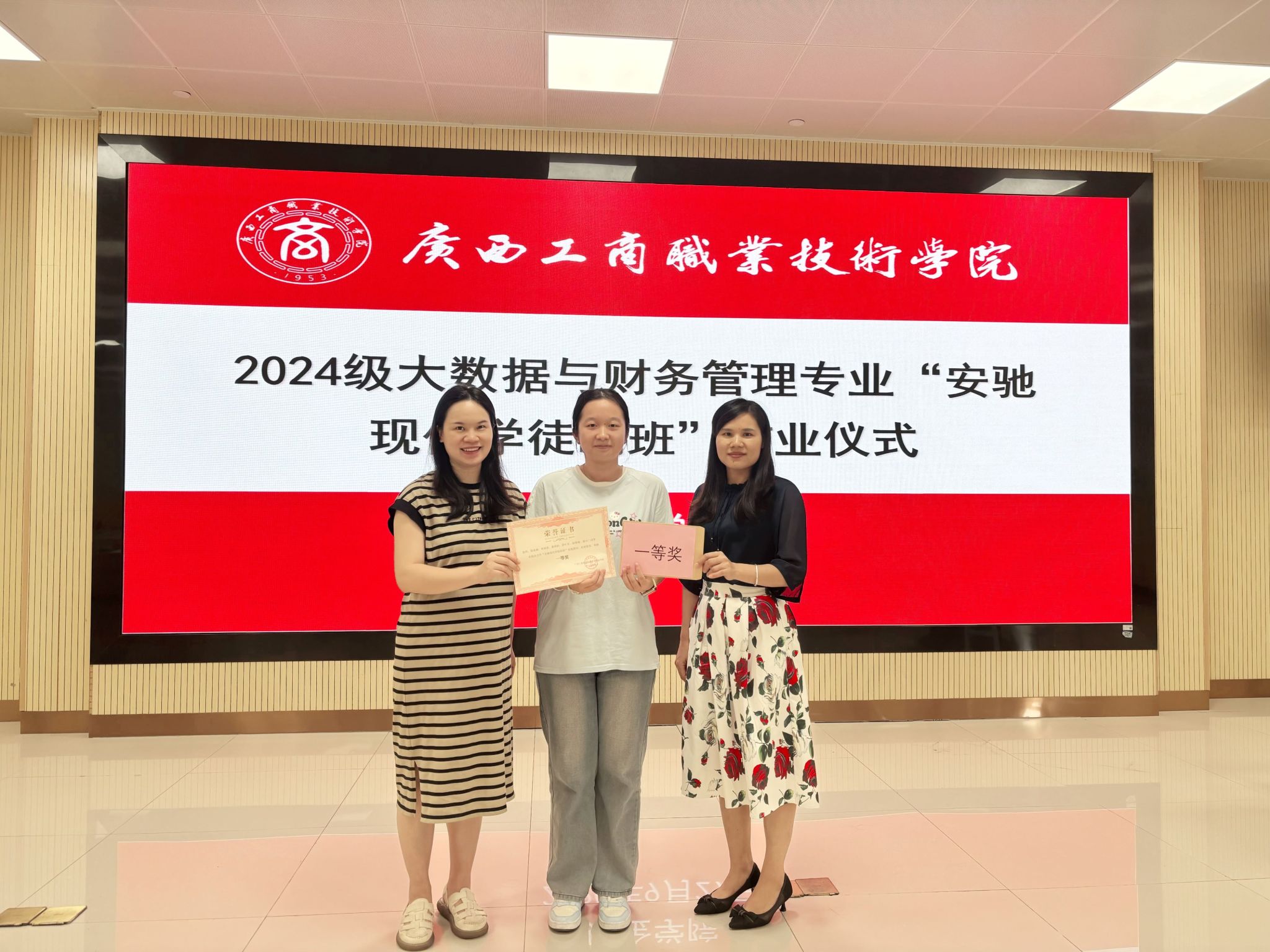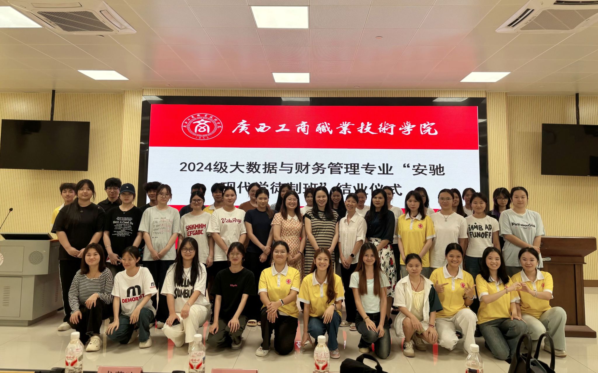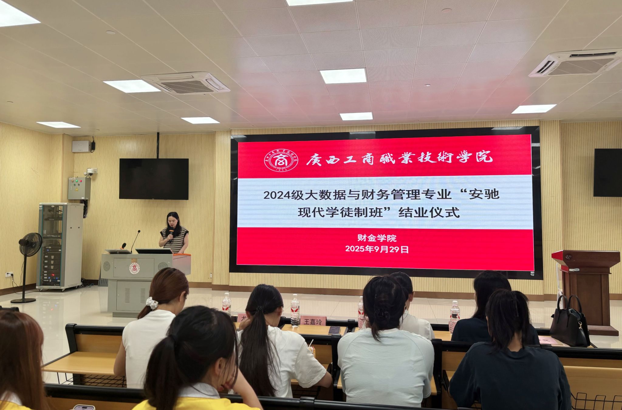 2025年9月29日下午,财金学院在武鸣校区举行2024级大数据与财务管理专业“安驰现代学徒制班”结业仪式。财金学院副院长王嘉玲、广西安驰财务管理有限公司副总经理周朝泳等出席结业仪式,学徒制班全体同学参加结业仪式。