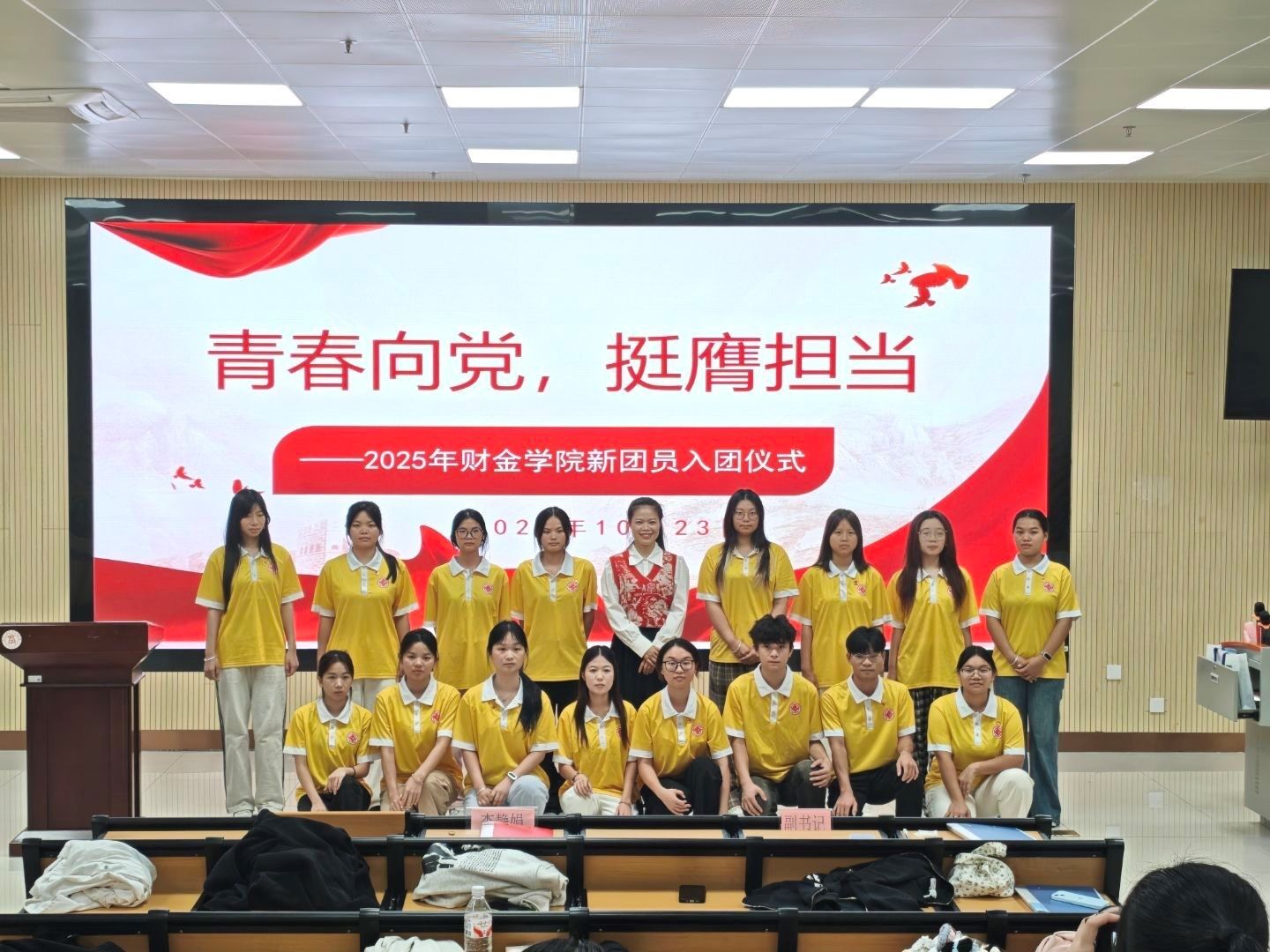 10月23日,财金学院在武鸣校区A2-101教室举行2025年下半年新团员入团仪式。财金学院团委负责人李静娟老师、全体新发展团员以及老团员代表参加本次入团仪式。