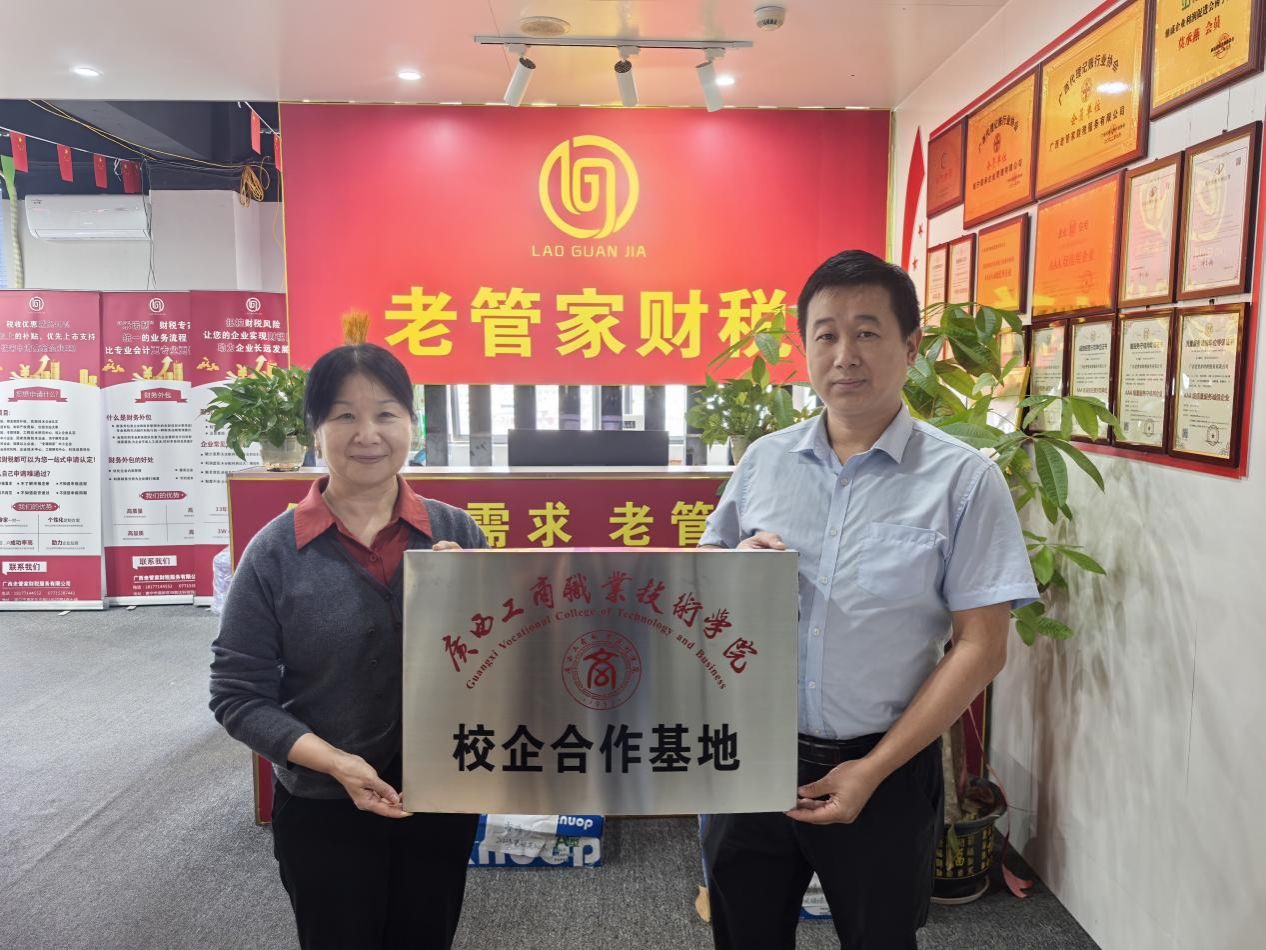 2025年11月11日,财金学院粟卫红院长和卢泰安老师赴广西老管家财税服务有限公司开展校企合作签约与挂牌仪式活动,并亲切看望我校在该公司实习的李婉婷同学。