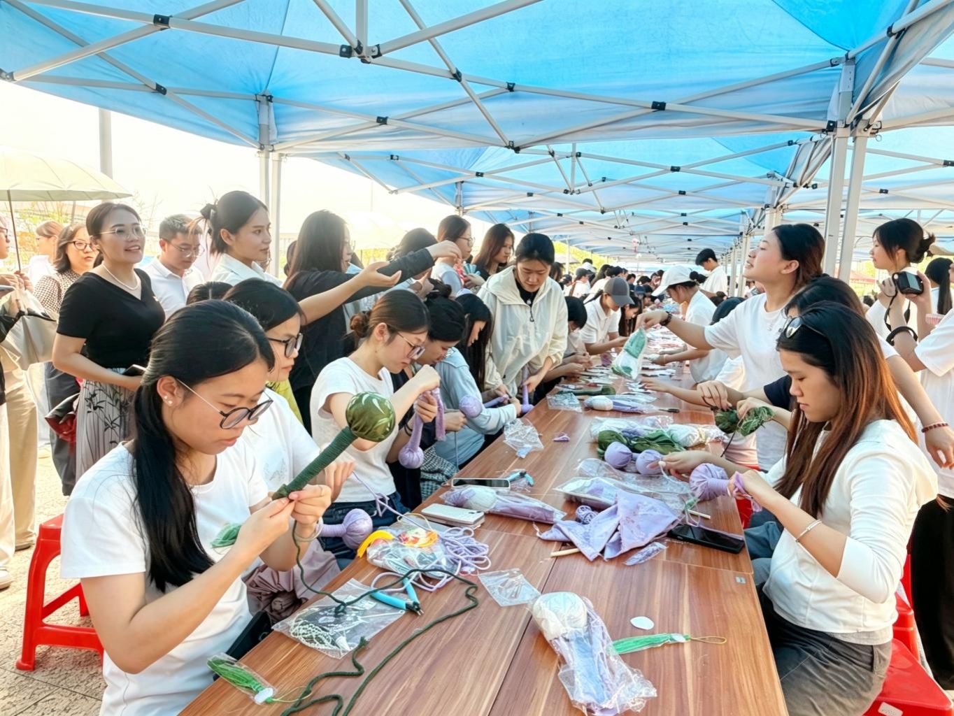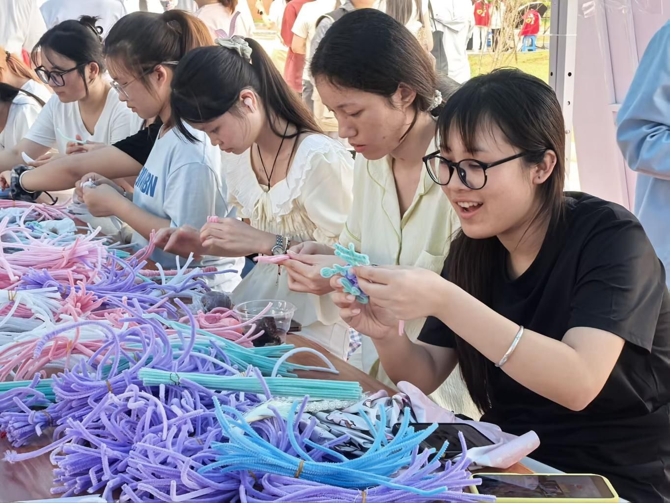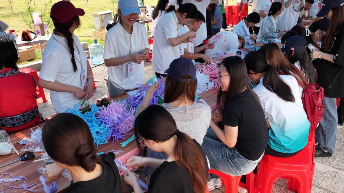 活动现场暖意融融、氛围热烈,既饱含壮乡民俗的浓郁底蕴,更彰显学院同学们守望相助的团结底色。学院精心布置活动展区、筹备各类手工艺品制作的原材料,邀请指导教师与优秀学生骨干现场指导,细致拆解手工艺品的制作技法,解读其承载的民族文化内涵与民俗寓意。同学们分组协作,动手扭拧扭棒编扎出寓意吉祥的绣球,制作艾草锤寄托安康祝愿,用蚕丝绕出团扇上的民俗雅韵,设计创作特色冰箱贴留存活动记忆,全程全神贯注投入手工艺品创作,在动手实践中触摸非遗发展脉络,感受壮乡文化的独特内涵。